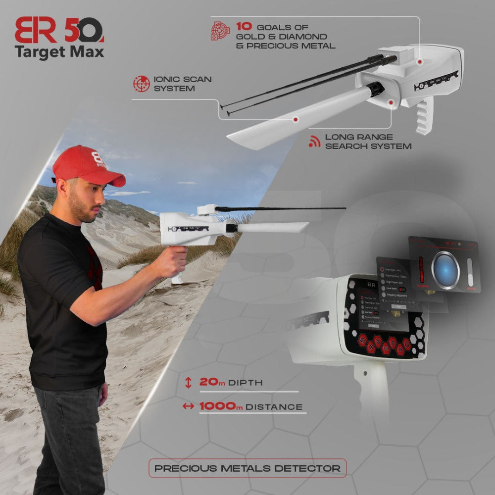El usuario del nuevo dispositivo BR 50 TARGET MAX puede alcanzar objetivos valiosos y tesoros preciosos más fácil y rápido que antes. Este dispositivo brinda lo que el usuario necesita de técnicas que lo ayuden en más escaneos y en sintonía con todos los terrenos y terrenos, ya que este dispositivo incluye todos los sistemas de detección desde largas distancias.